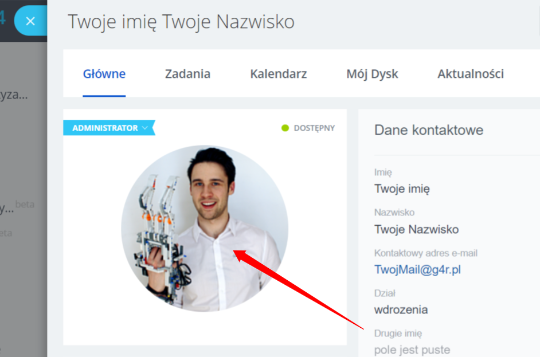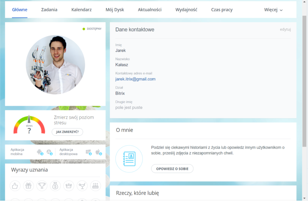 W centrum systemu jest CZŁOWIEK! Dlatego w Bitrix24 użytkownicy ma swój profil, który jest mini wizytówką każdego z nas. Wydaję się, że nie jest to najważniejsze, ale jak mawia klasyk "nic bardziej mylnego".