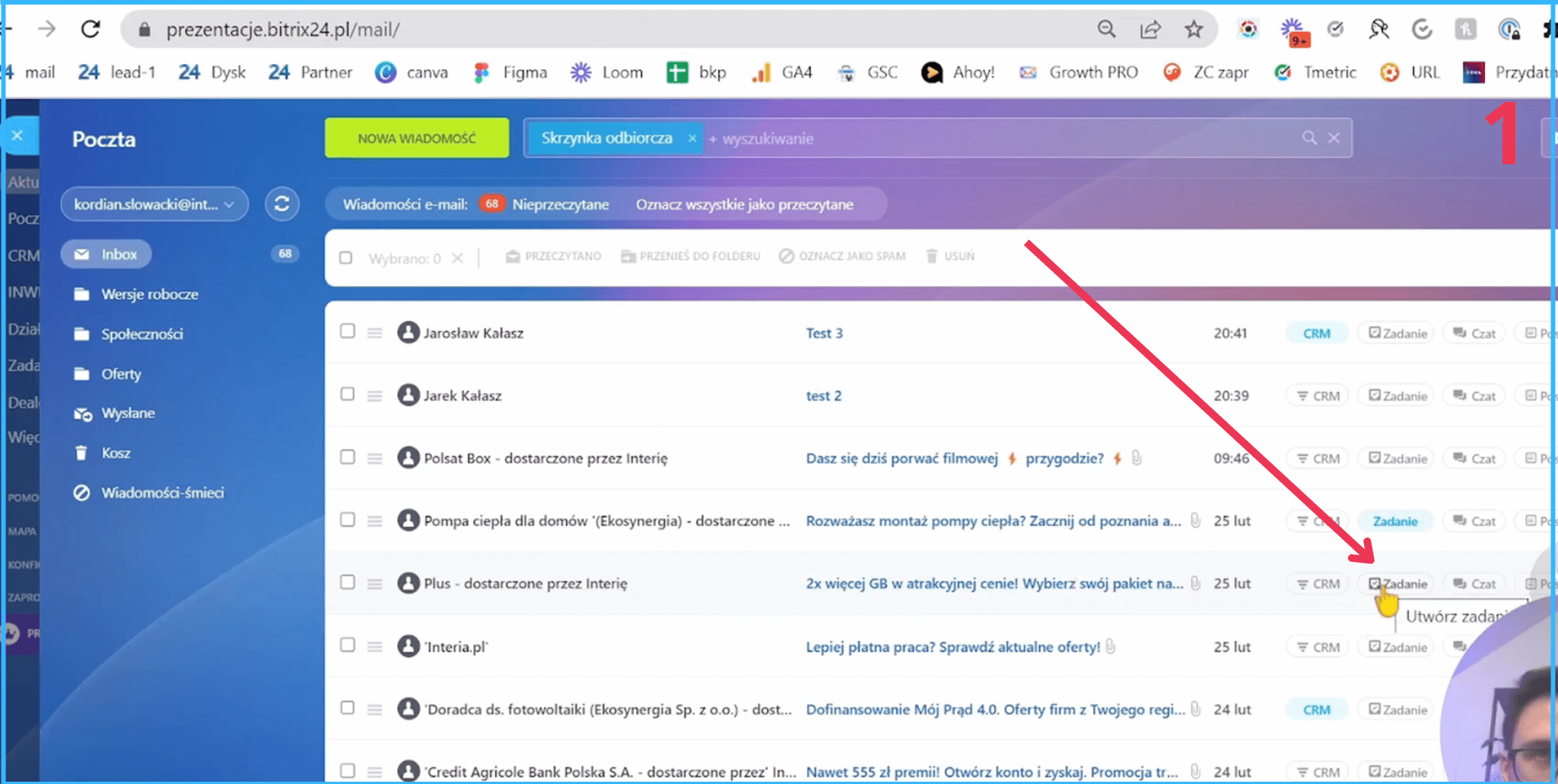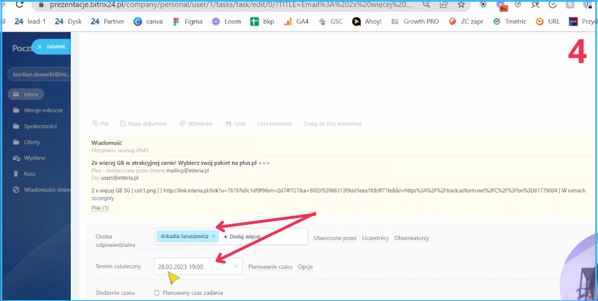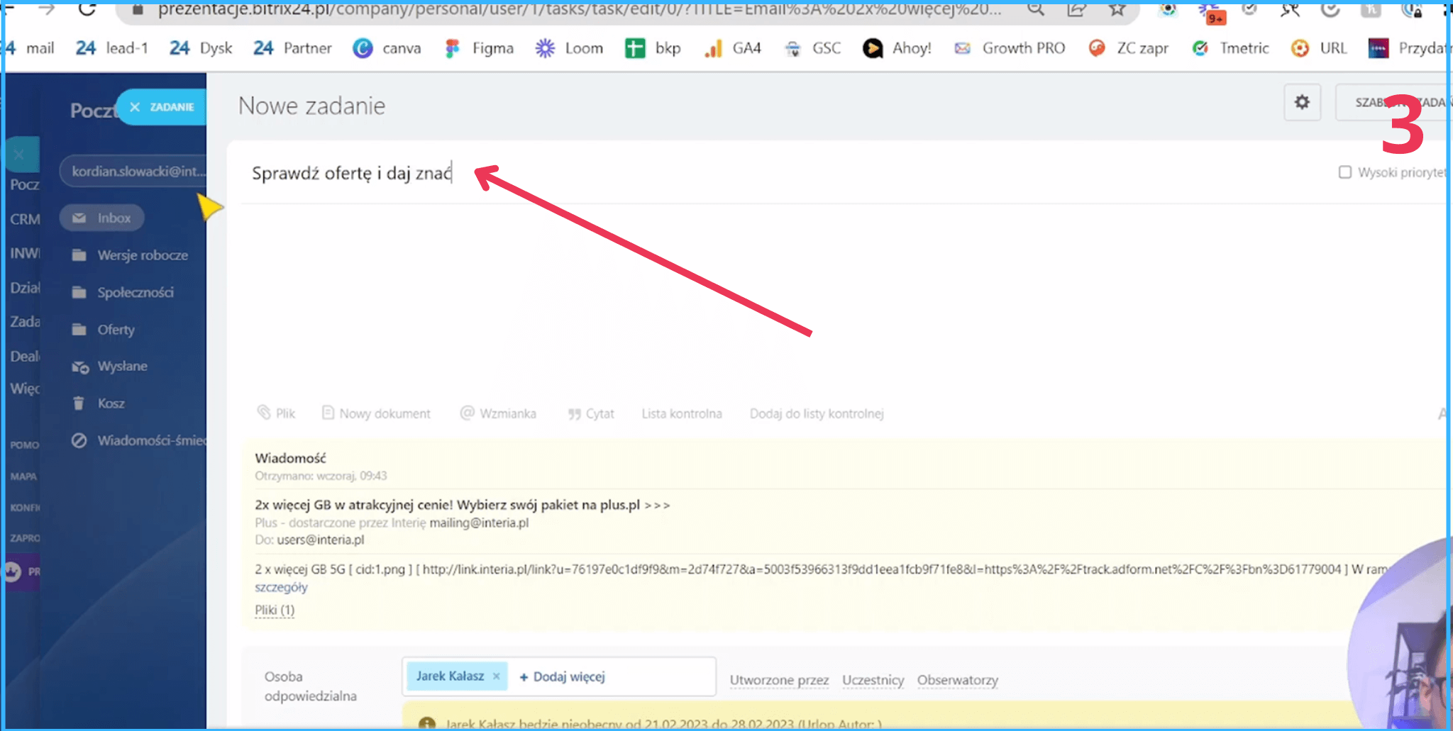 Na skrzynce pocztowej na niebiesko będzie podlinkowane zadanie do maila. I Bitrix sam będzie dawał znać, kto musi wykonać zadanie i do kiedy. Nie będziemy musieli o tym pamiętać, czy wysłaliśmy coś czy nie, system o tym pamięta.