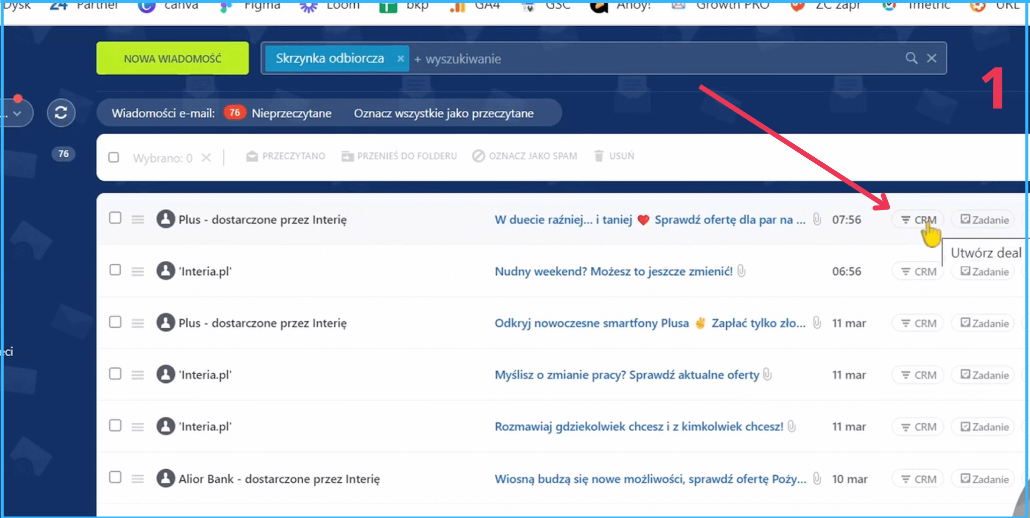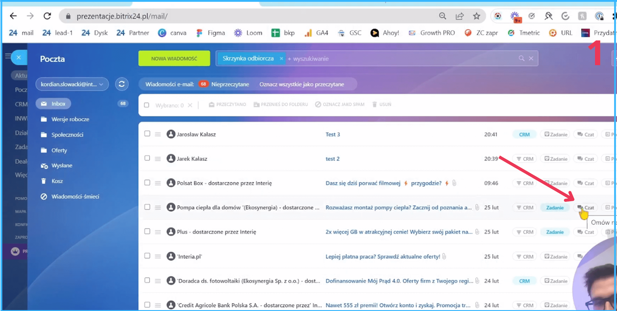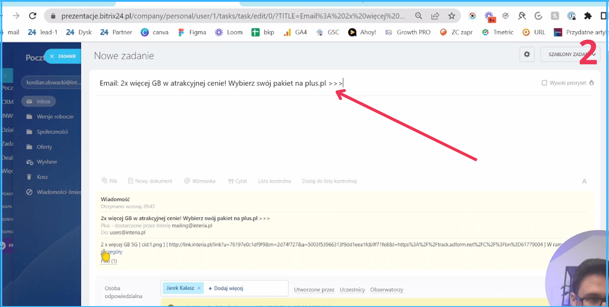 Na skrzynce pocztowej na niebiesko będzie podlinkowane zadanie do maila. I Bitrix sam będzie dawał znać, kto musi wykonać zadanie i do kiedy. Nie będziemy musieli o tym pamiętać, czy wysłaliśmy coś czy nie, system o tym pamięta.