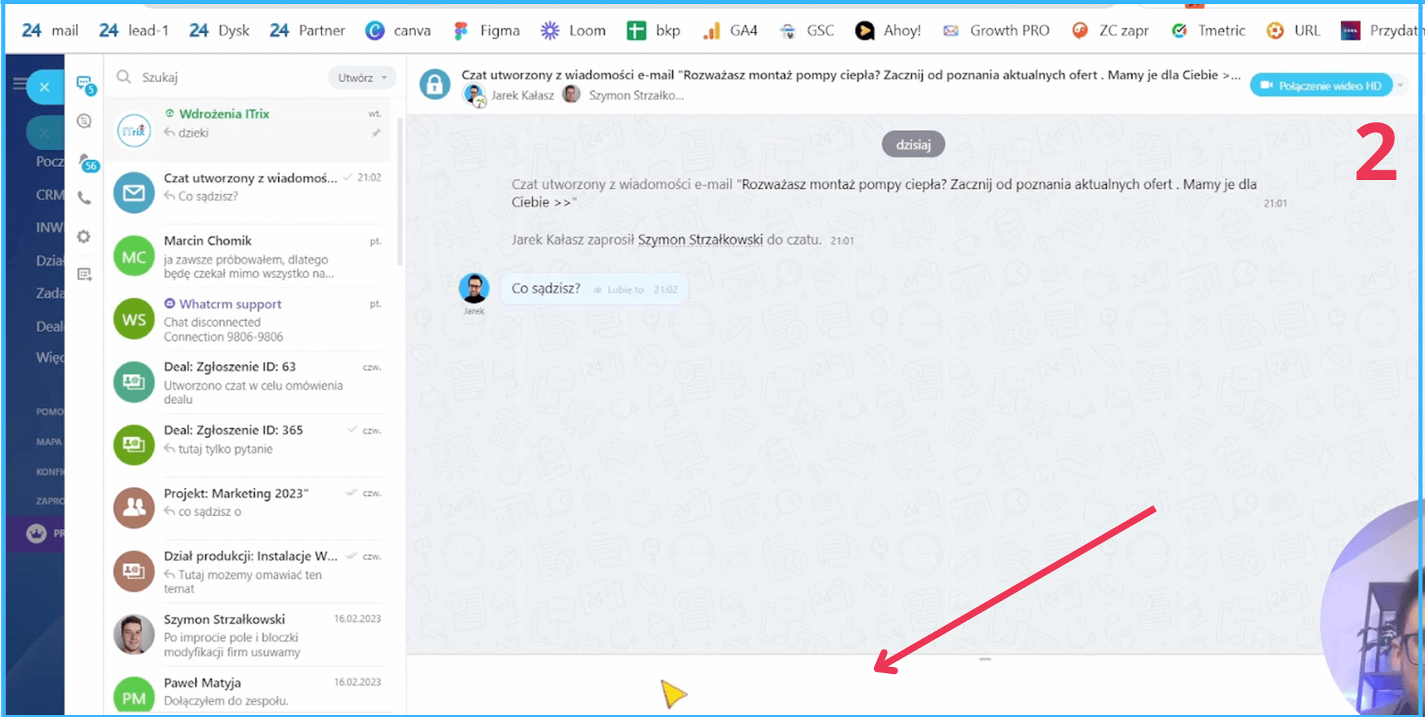 Jeżeli chcemy omówić danego maila z kolegą/koleżanką z firmy, to klikamy funkcję ‘Czat’ i od razu tworzy nam się wewnętrzny czat, możemy tam zaprosić konkretne osoby.