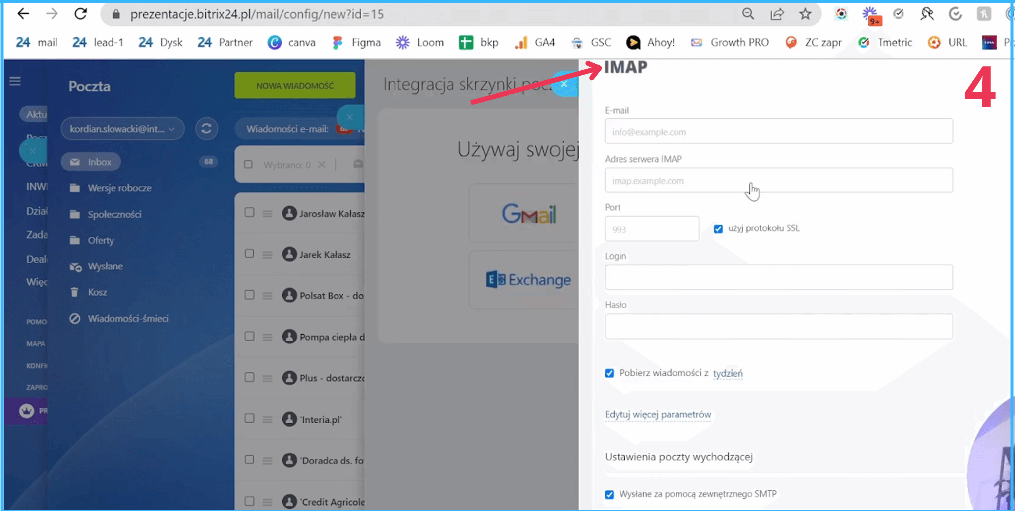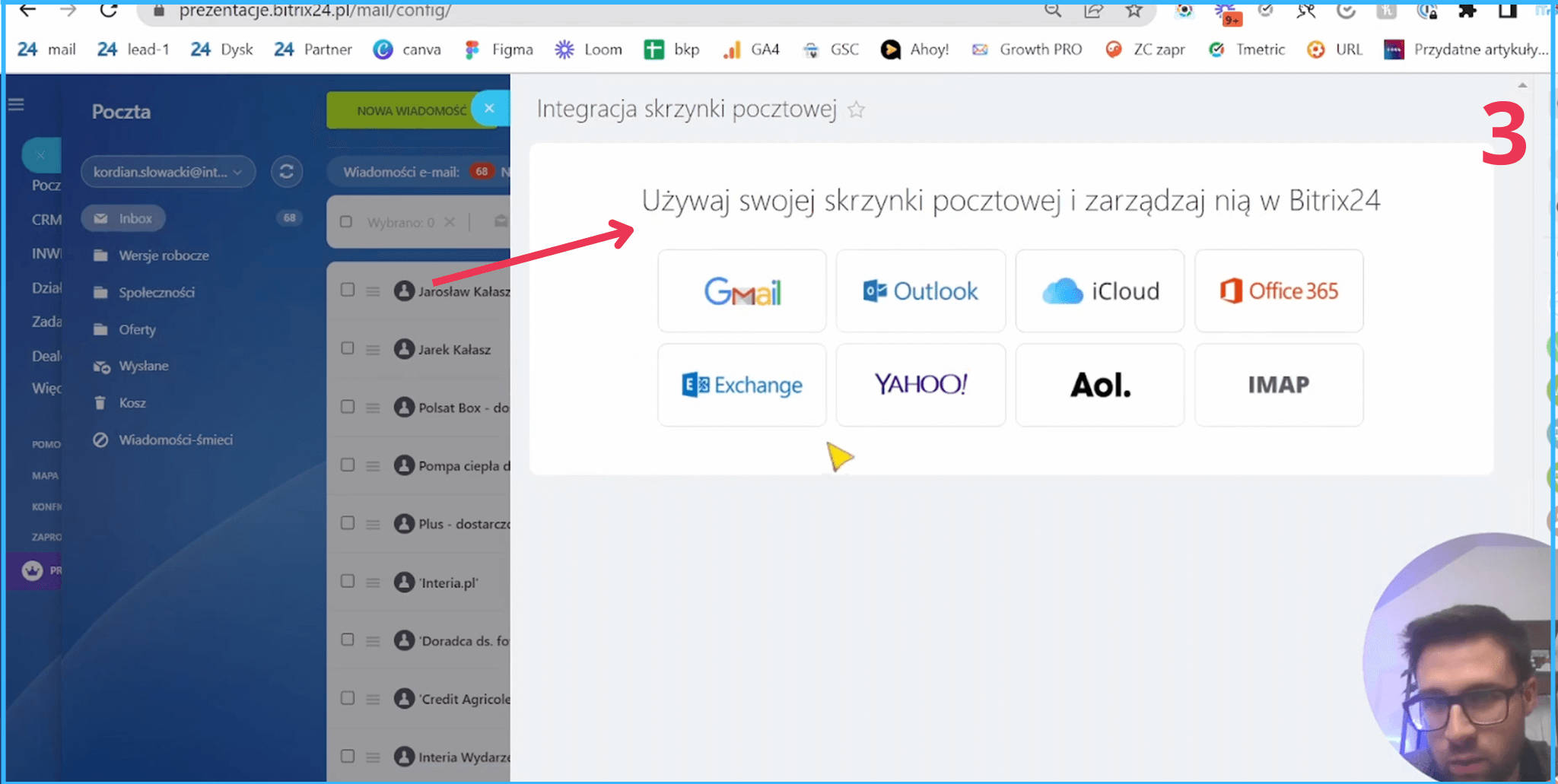 Jeżeli chcemy podłączyć nowa skrzynkę, musimy wybrać opcję ‘Podłącz nowe’, bardzo łatwo możemy to podłączyć przez największe skrzynki pocztowe lub po IMAP’ie podłączymy każdą skrzynkę pocztową do Bitrix.