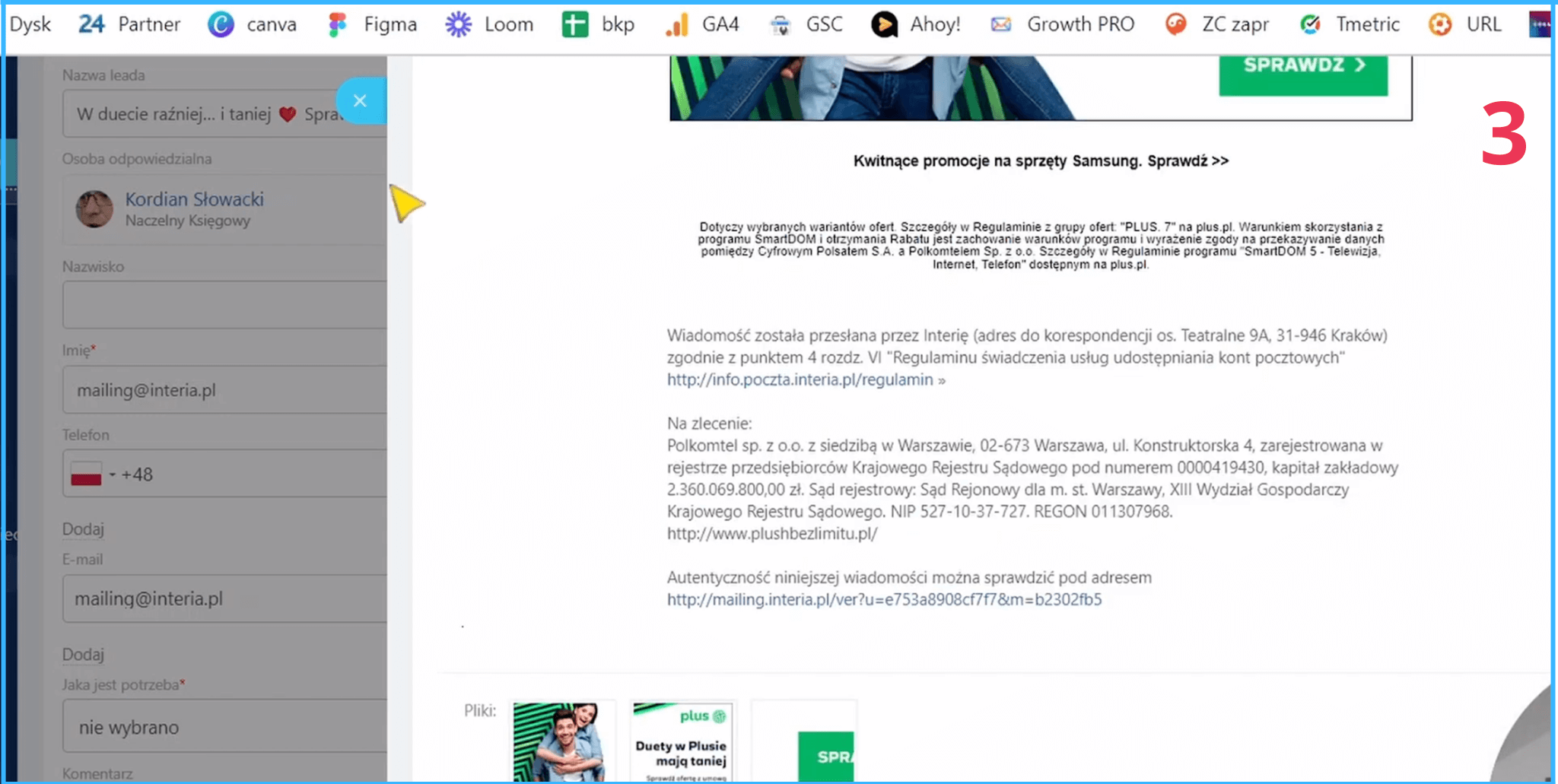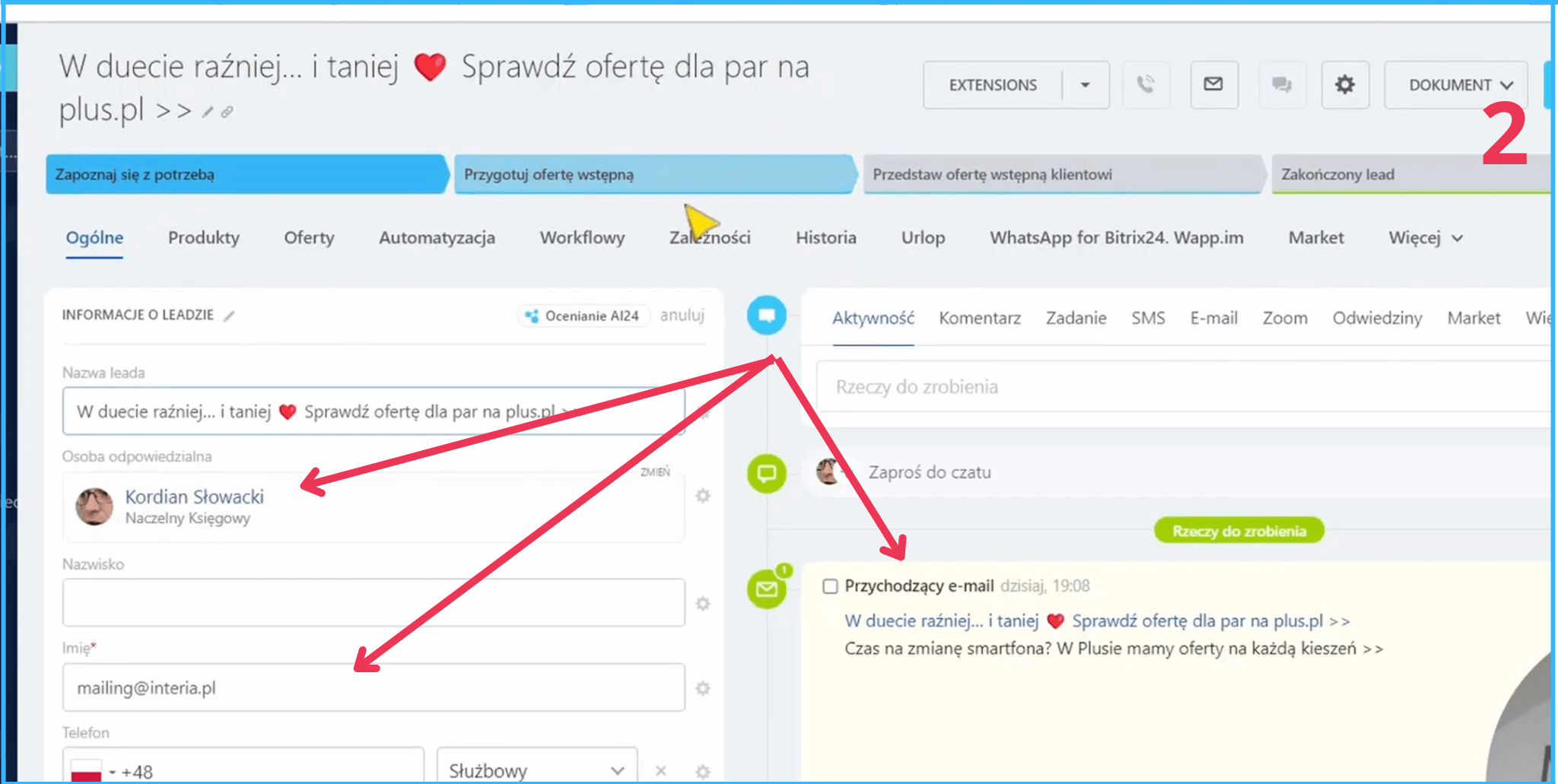 Możemy kliknąć w wiadomość i zobaczyć jej treść. Możemy dalej kontynuować tą rozmowę, mamy email od razu podpięty. Jeżeli w stopce byłby telefon, to Bitrix by go odczytał i przypisał do danego etapu.