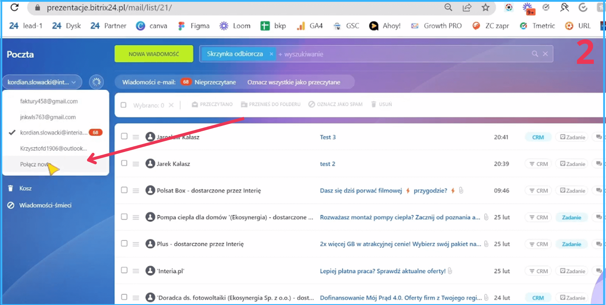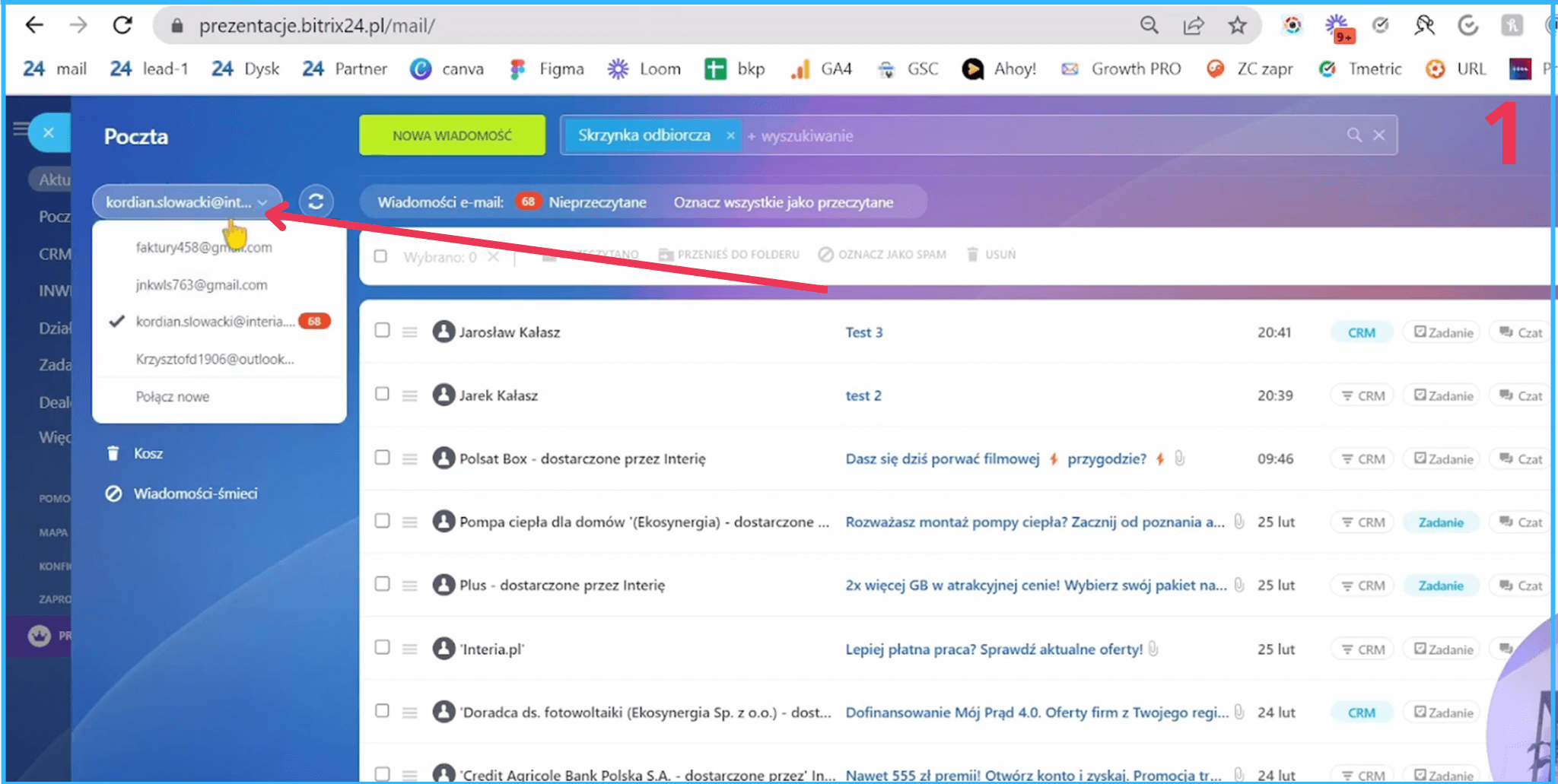 Często zdarza się tak, że w ramach prowadzenia biznesu obsługujemy kilka skrzynek pocztowych. Przeklikiwanie się między tymi skrzynkami w Bitrix jest dosłownie na jedno kliknięcie. Jest to łatwe, proste i przyjemne.