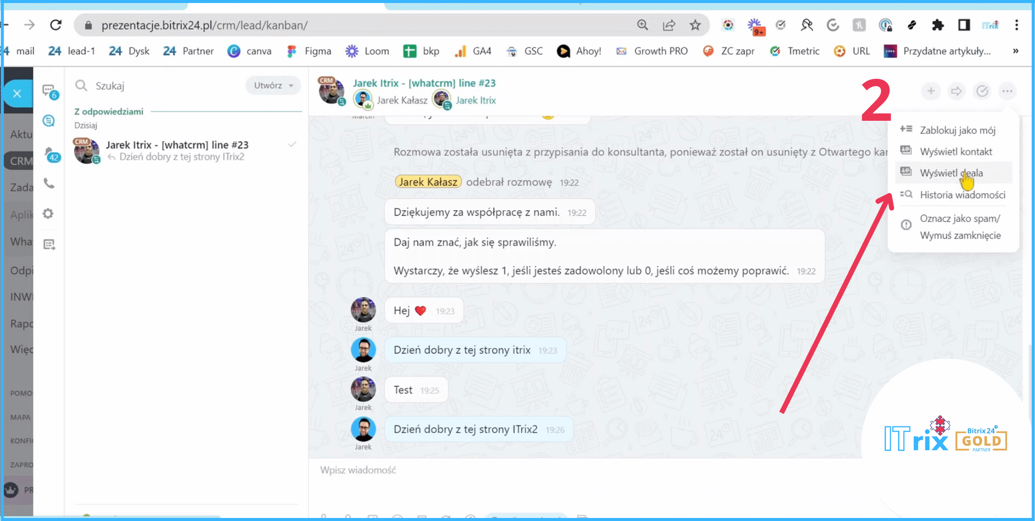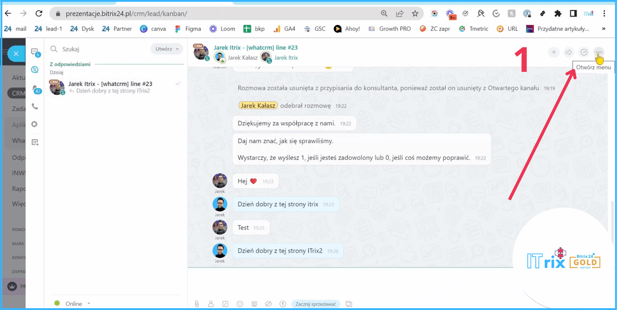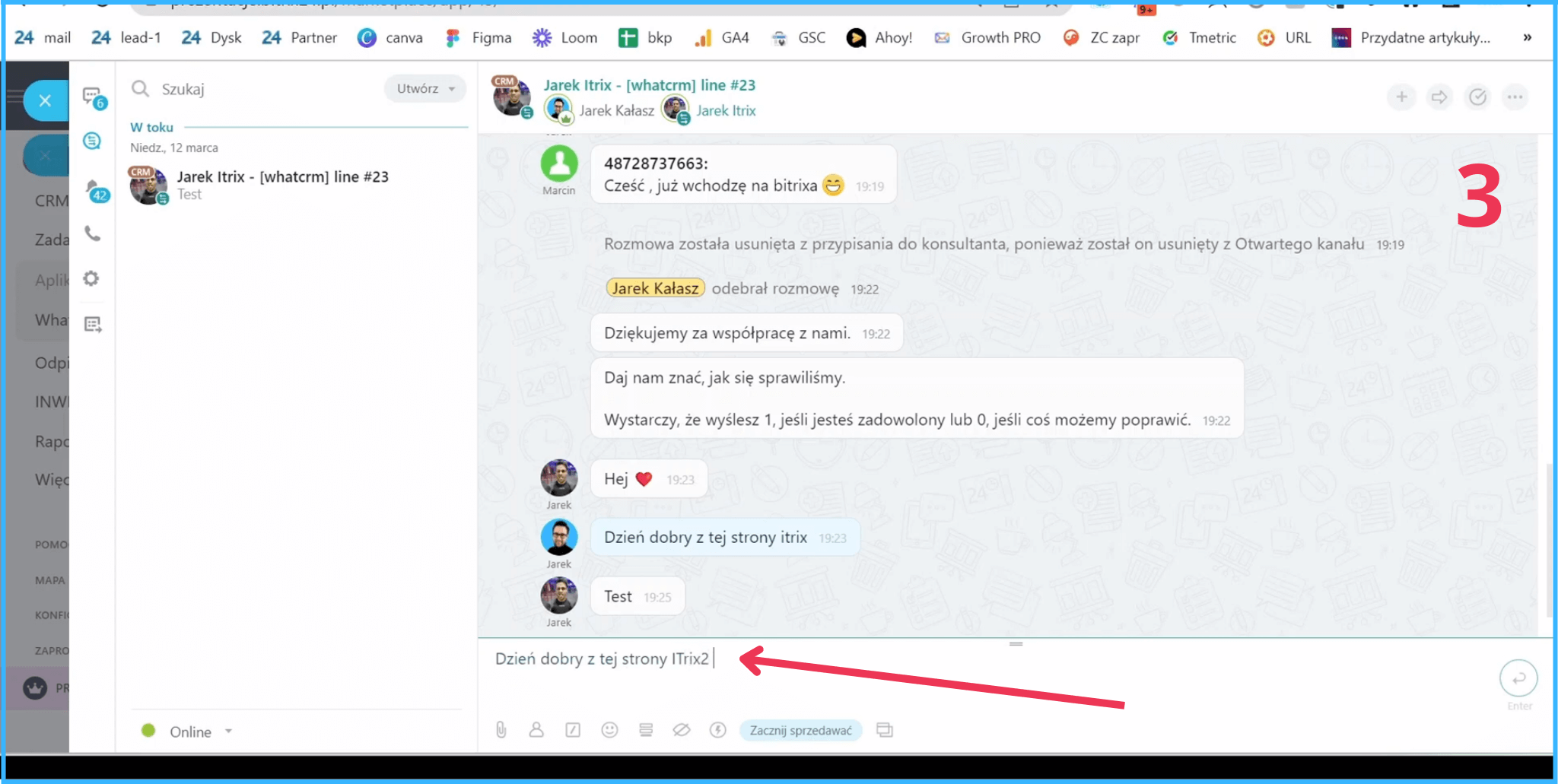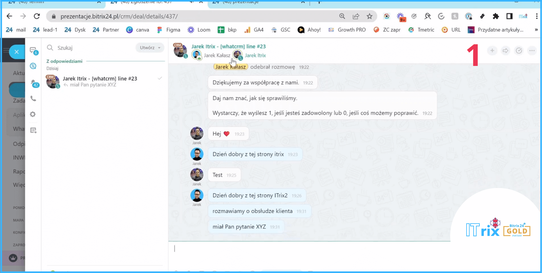 Tą wiadomość od razu otrzymaliśmy na Bitrixa.Dostaliśmy powiadomienie, że Jarek napisał do nas na kanale WhatsAppowym. I tutaj mamy historię naszej komunikacji.