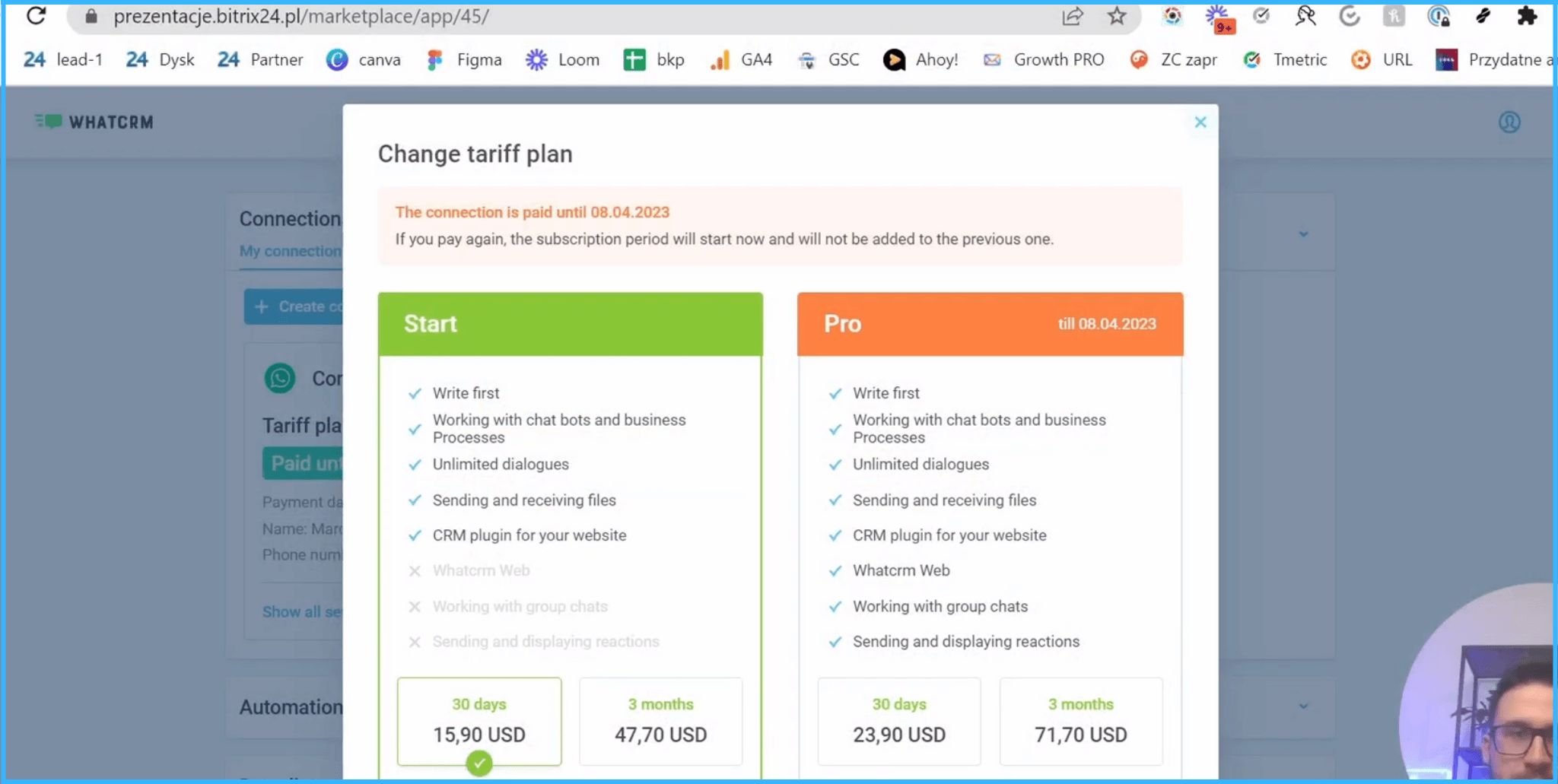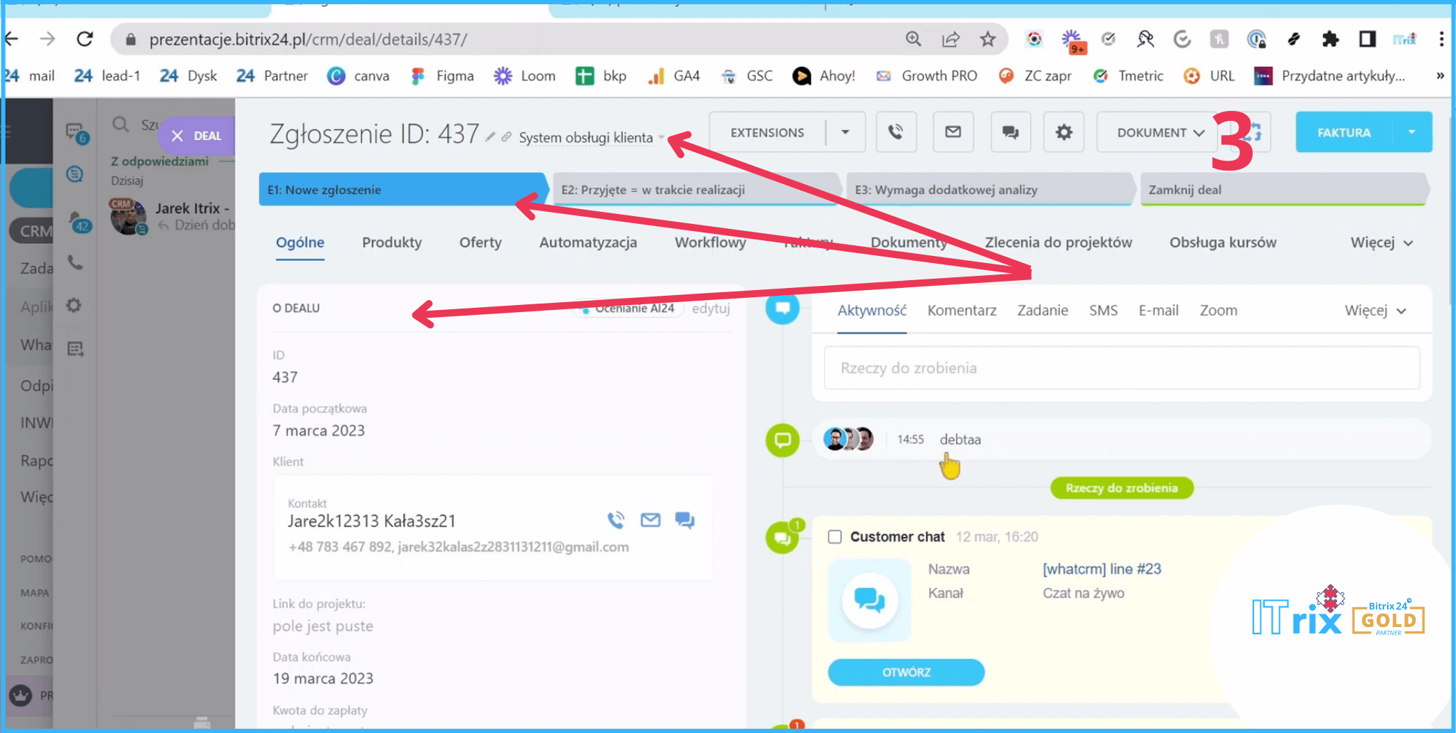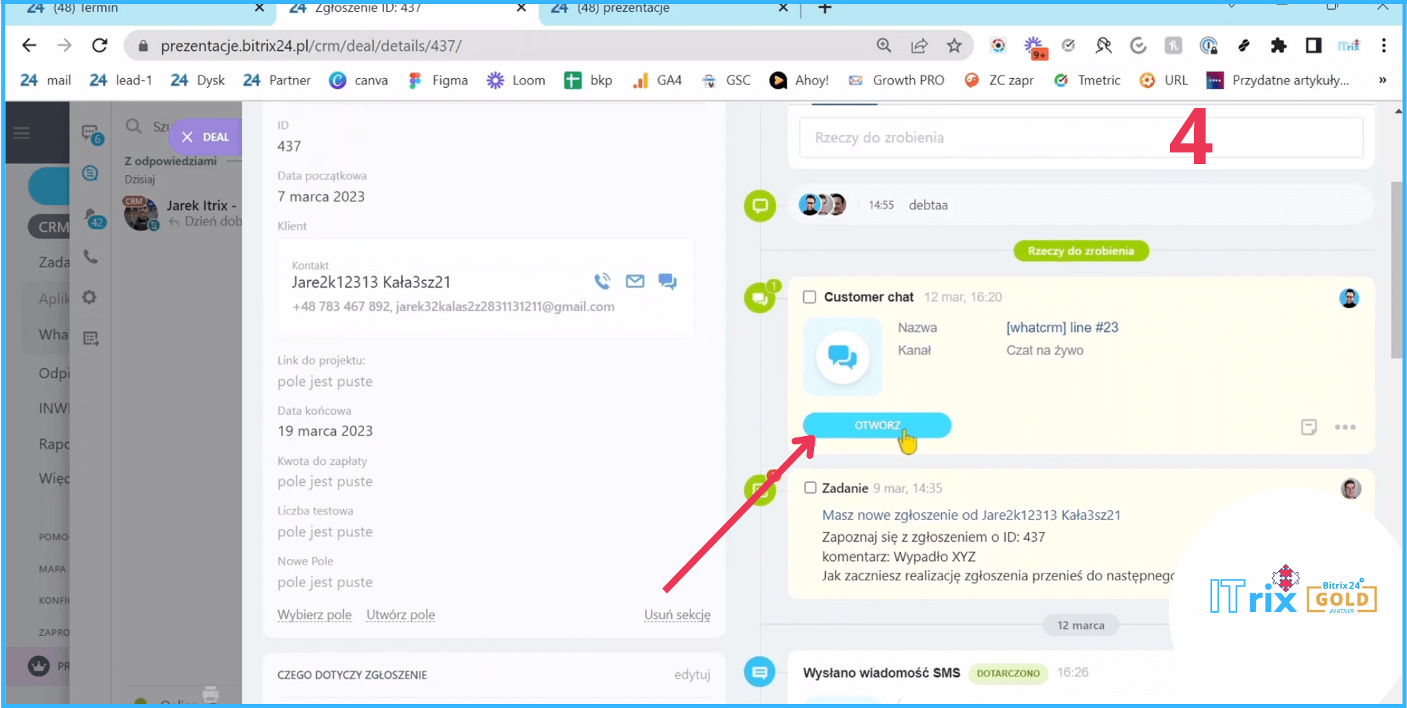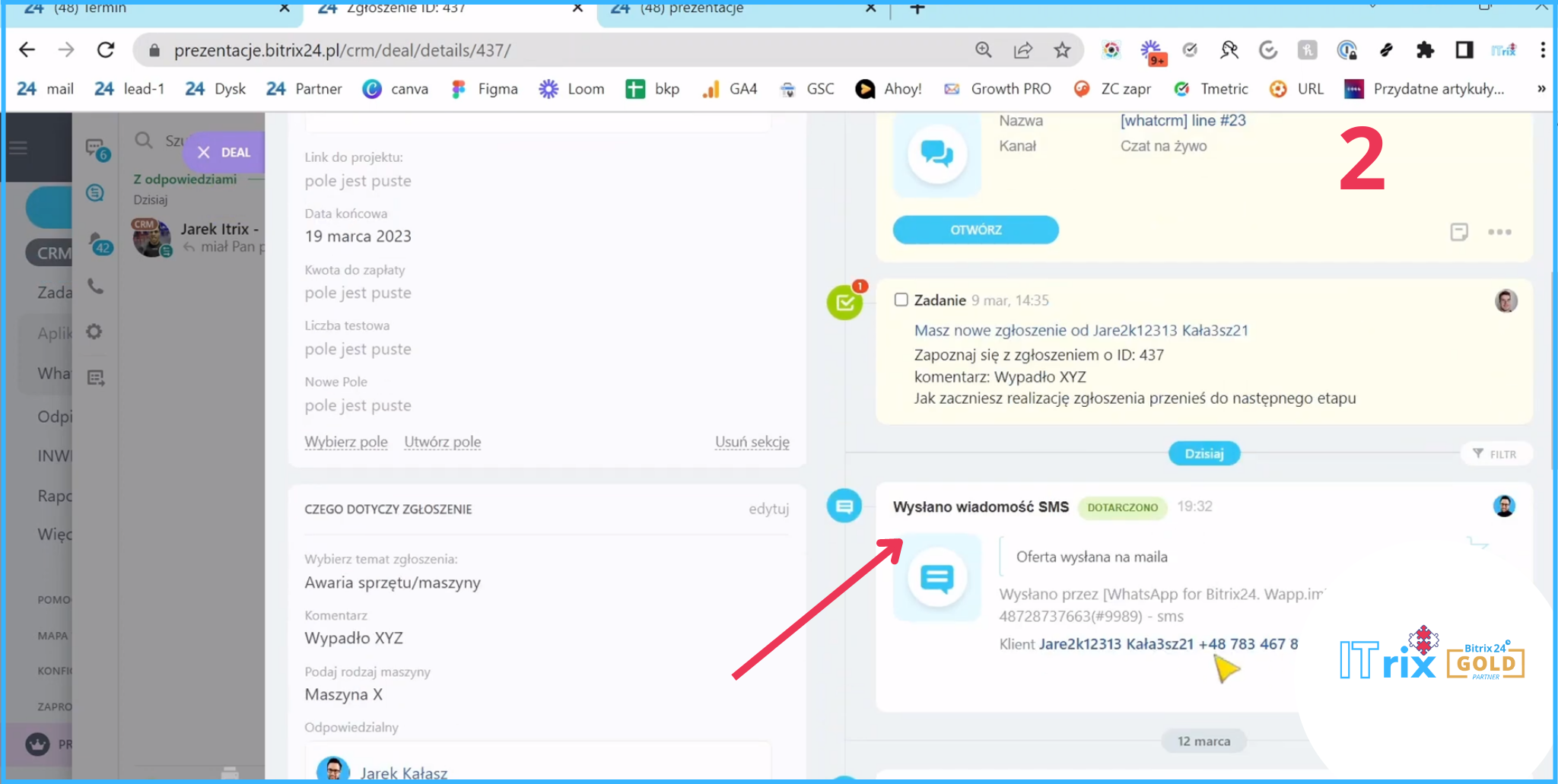 Tą wiadomość od razu otrzymaliśmy na Bitrixa.Dostaliśmy powiadomienie, że Jarek napisał do nas na kanale WhatsAppowym. I tutaj mamy historię naszej komunikacji.