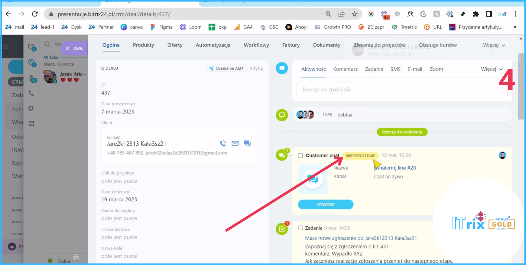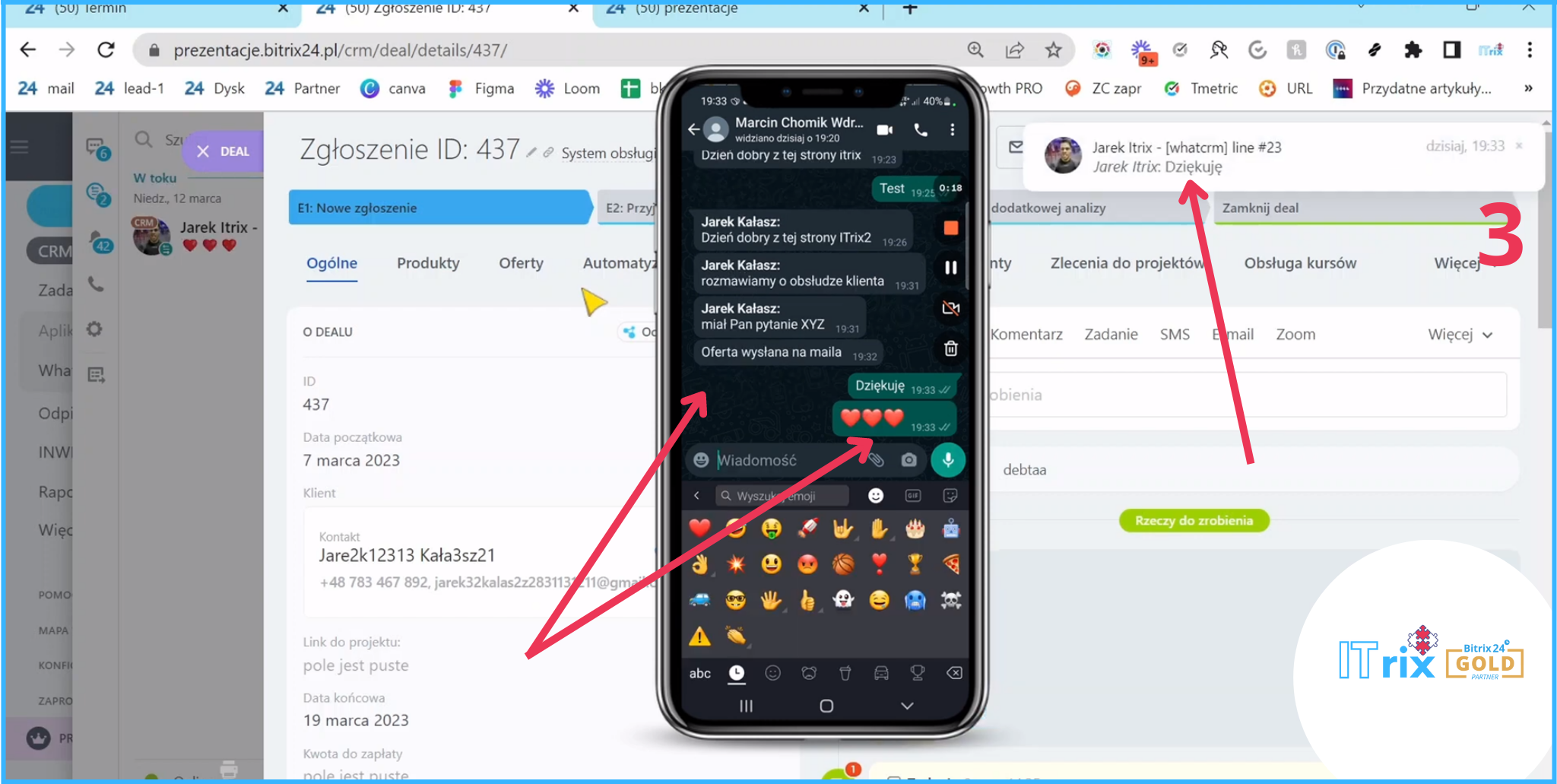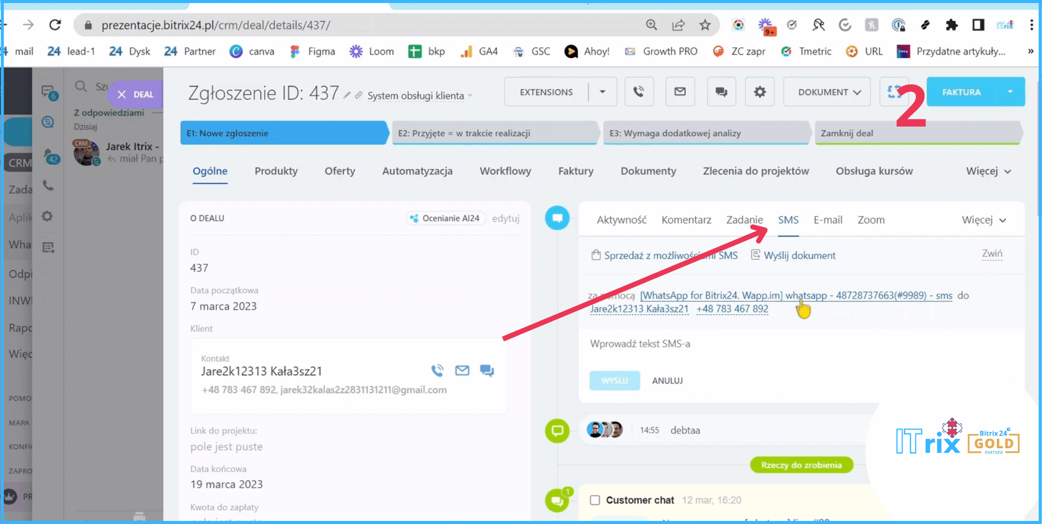 Czyli możemy mieć automatyczne powiadomienia o tym, że właśnie klient napisał na WhatsAppie. Możemy pisać do klienta z poziomu deala, jest to bardzo wygodne!