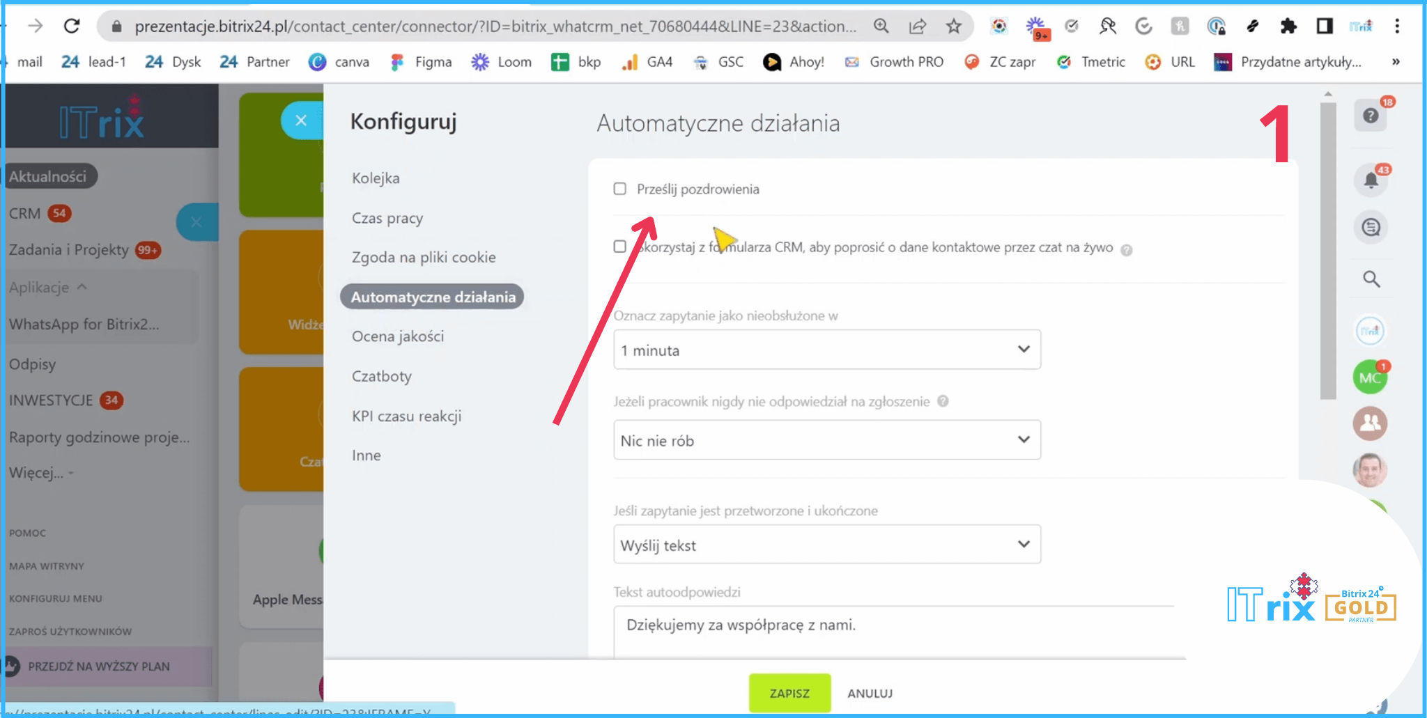 Teraz nie chcę aktywować tych pozdrowień, a np., jest zakończone zapytanie, mam automatyczną wiadomość, mogę jeszcze coś dopisać.