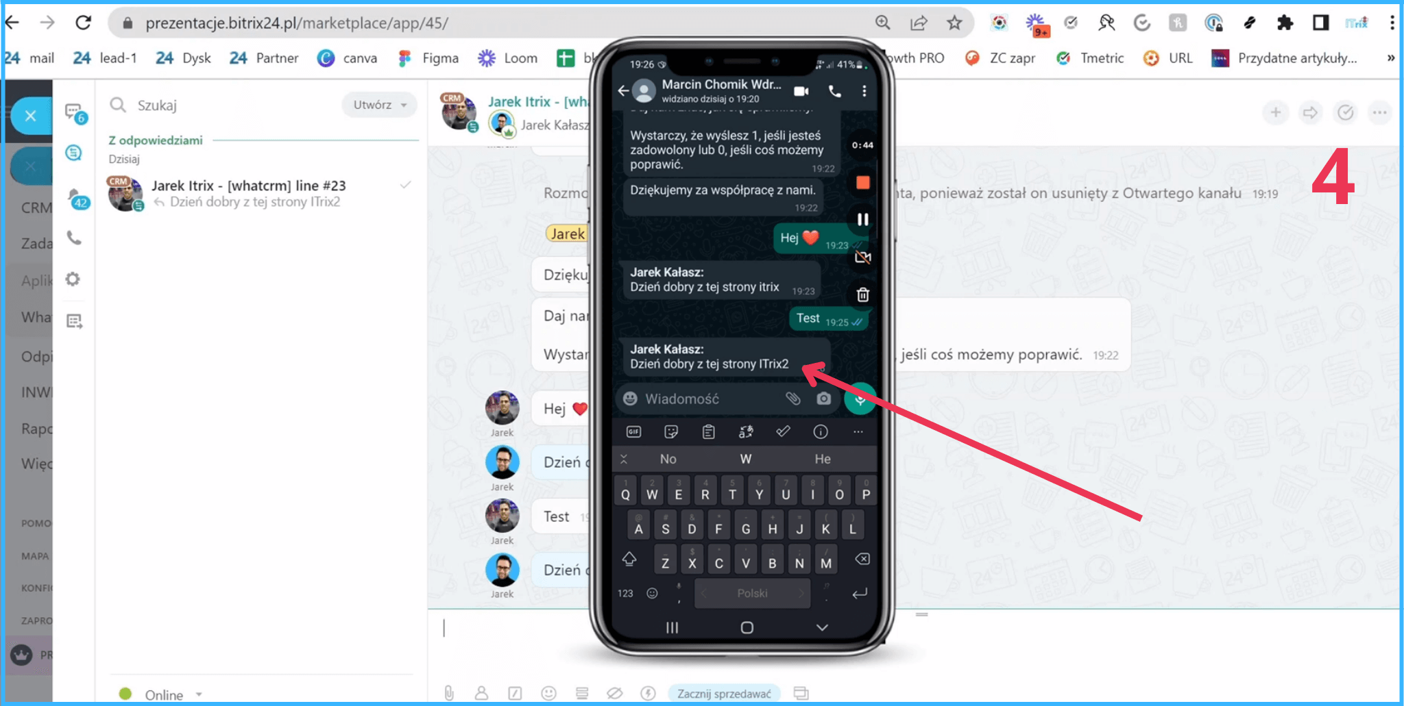 Wchodzimy na WhatsAppa i wysyłamy wiadomość. Trafia to oczywiście do naszego Bitrixa, mamy tutaj całą historię komunikacji, i możemy odpisać na wiadomość z poziomu Bitrixa.