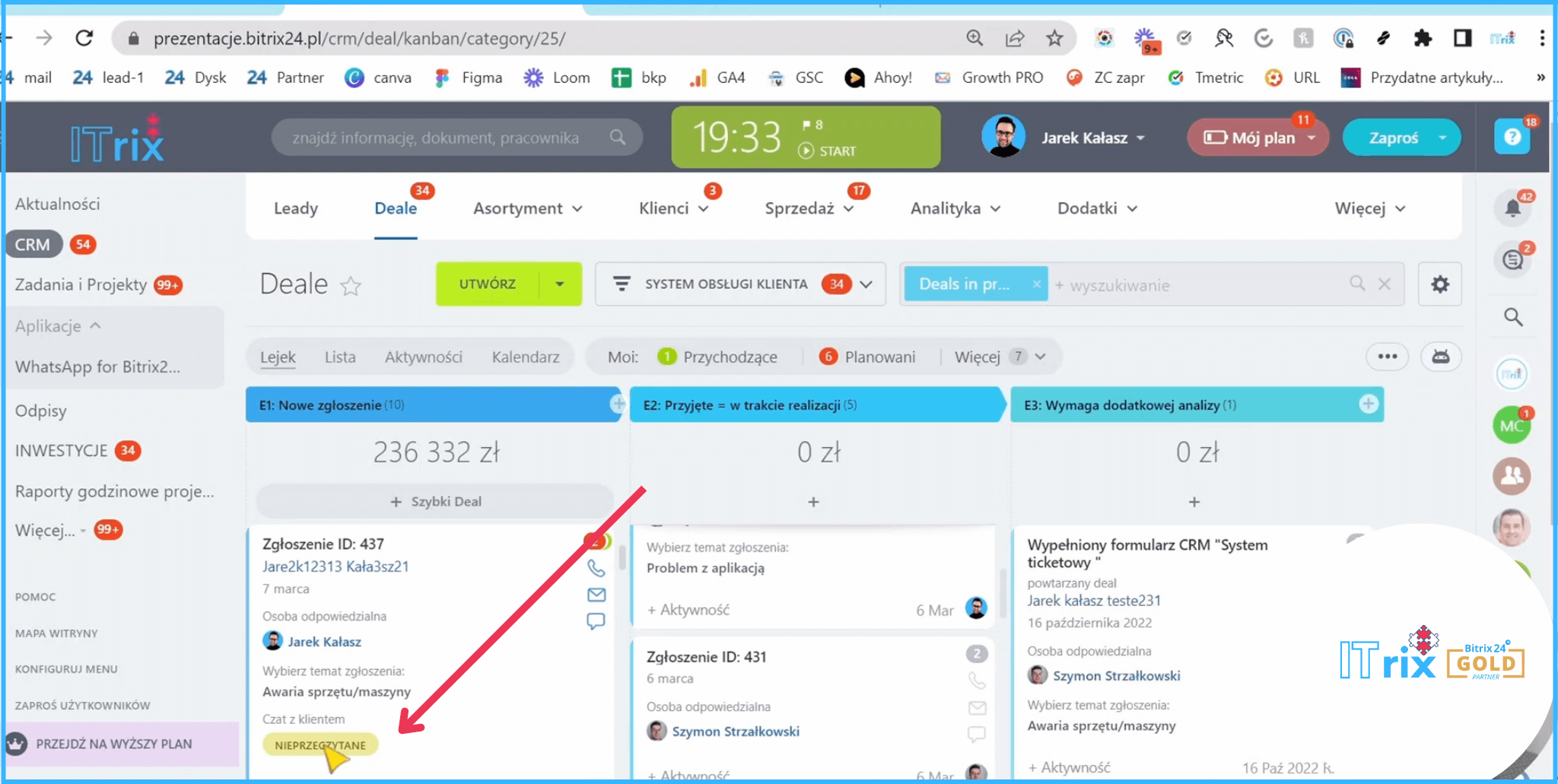 Jak przeskoczymy do CRM -> Deale -> wybierzemy odpowiedni lejek, to wyświetla nam się informacja, że czat z klientem jest nieprzeczytany.
