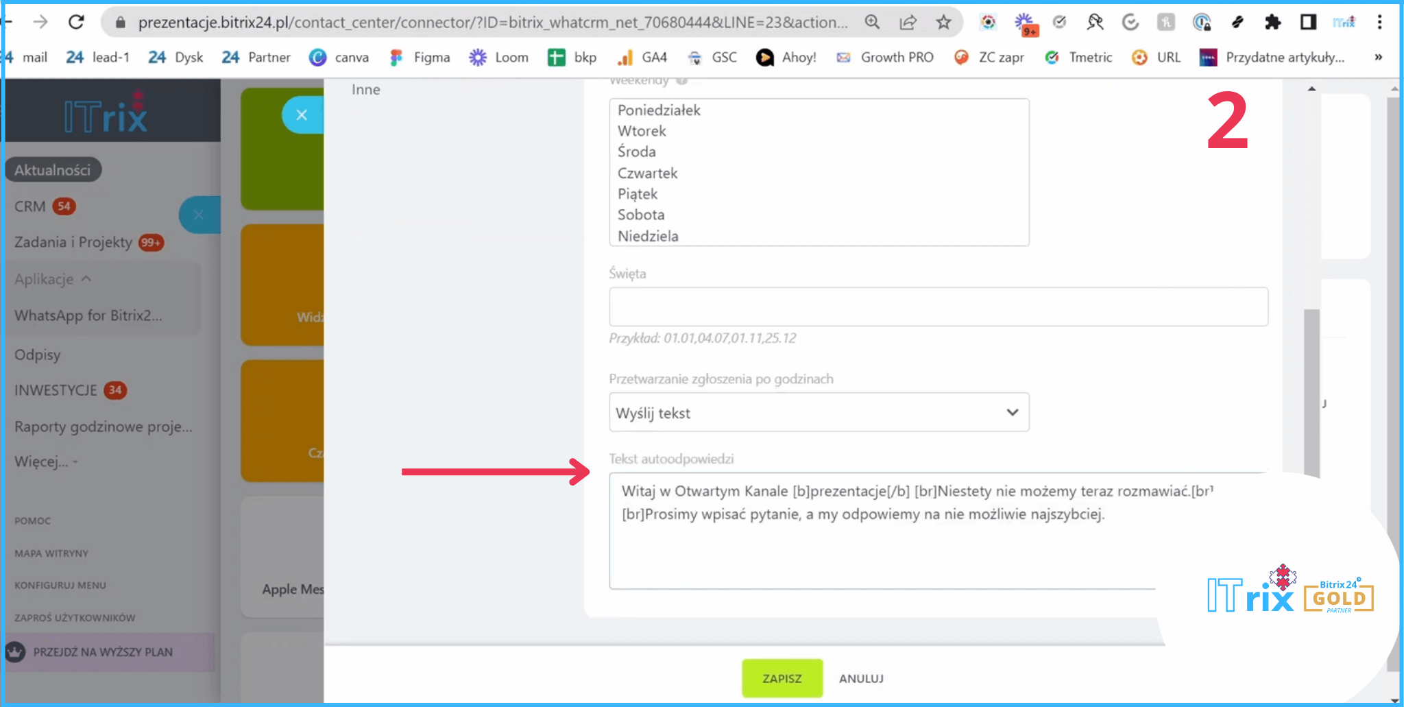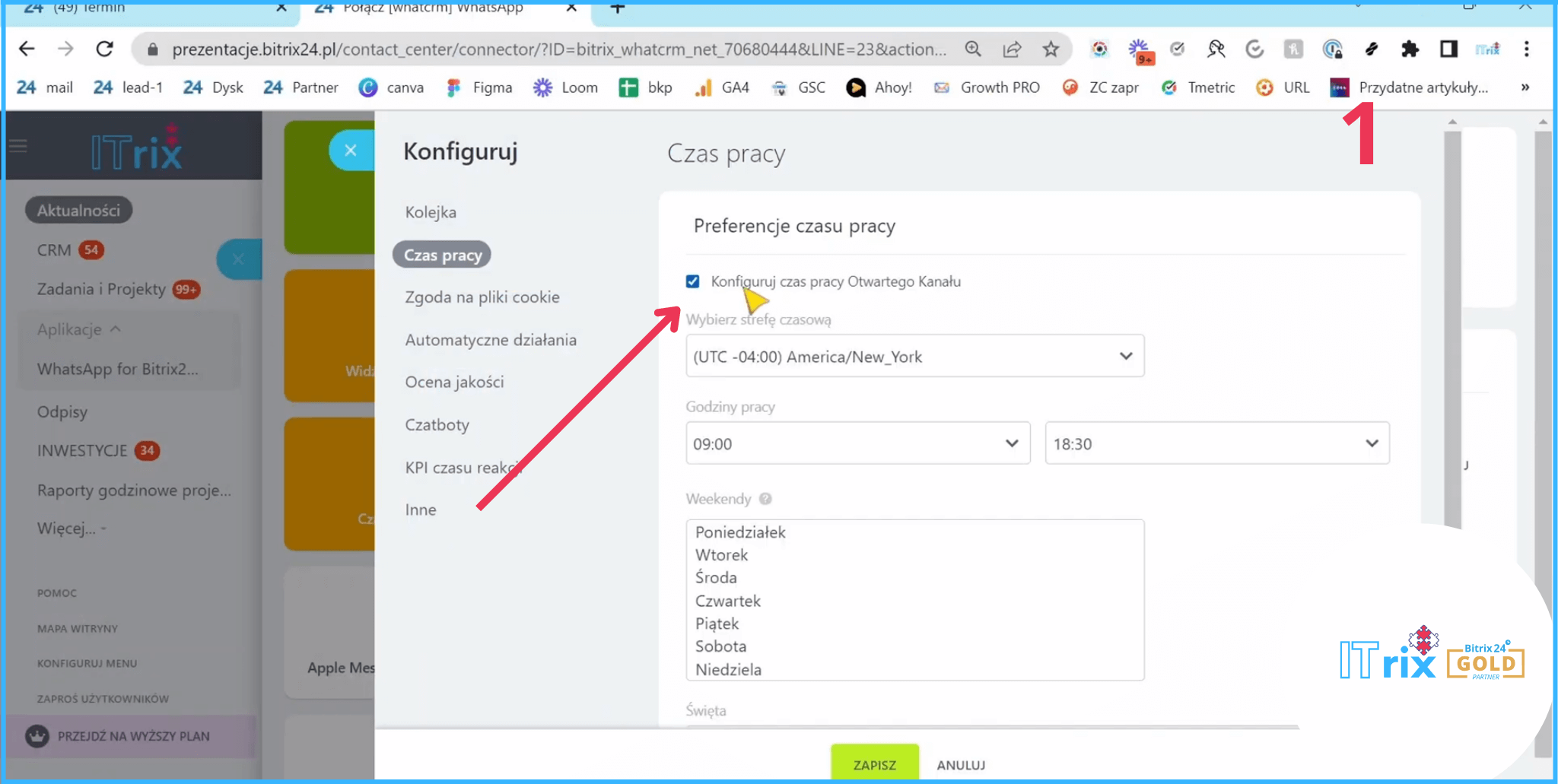 Wskakujemy do naszego Bitrixa i wchodzimy w konfigurator czasu pracy. Bardzo fajna opcja to skonfigurowanie czasu pracy. Możemy wskazać w jakich godzinach i nawet strefie czasowej odpowiadamy, i jeżeli nie jesteśmy w tych godzinach, to jest automatyczna odpowiedź, że nie możemy teraz rozmawiać.