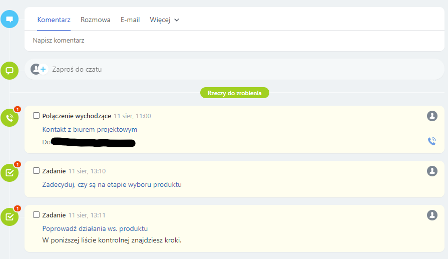 Ale to też niestraszne naszym rozwiązaniom! Od teraz każda inwestycja jest naznaczona etapem na którym przebywa oraz historią działań wraz z zakończonymi zadaniami, połączeniami i wiadomościami e-mail.