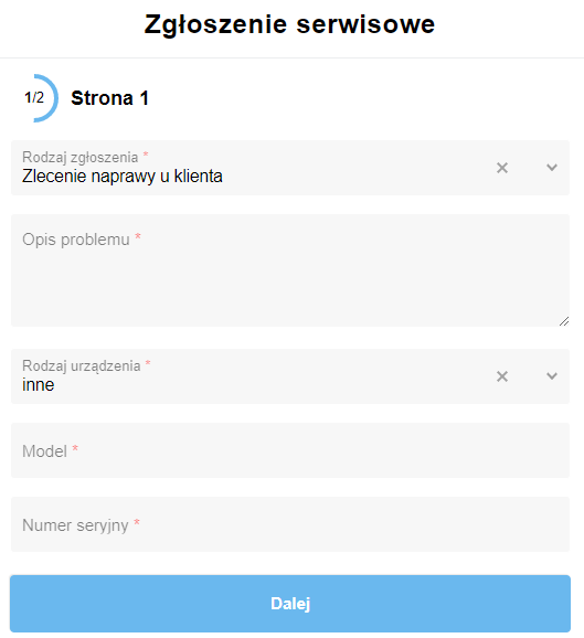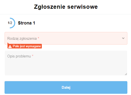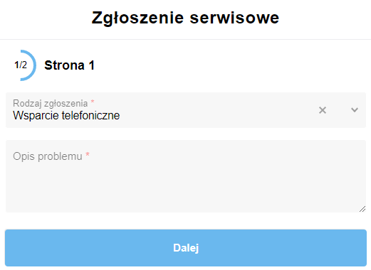 Po wybraniu rodzaju zgłoszenia, pojawiają się wszystkie dodatkowe pola, jakich potrzebujemy do obsługi danego zapytania.