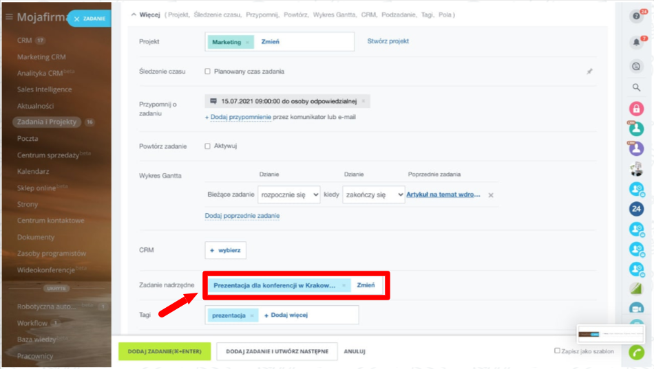 - Dodawanie zadania odbywa się w parę "kliknięć", a Bitrix24 będzie automatycznie śledzić czas trwania zadania,